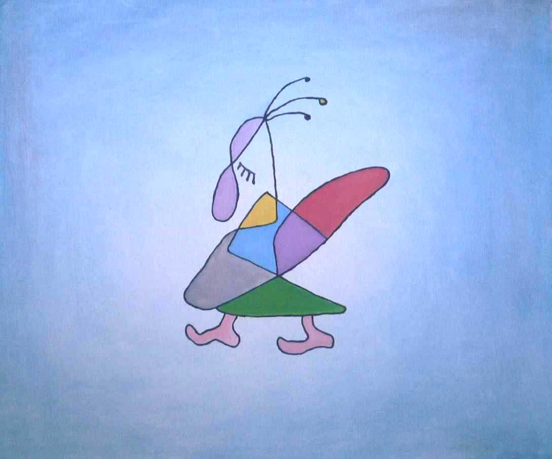 | Dies ist auch ein lullisches Bild (Näheres zu "lullish" s. in Reiter Biografie ). Nur die Füße, das Auge, die drei Haare und die Farbenwurden hier der Ein-Strich-Zeichnung hinzugefügt. Das Ergebnis ist ein zufriedener Mensch, den nichts so leicht aus der Ruhe bringen kann. - Auch dieses Bild fand als Poster sehr viele Käufer. |