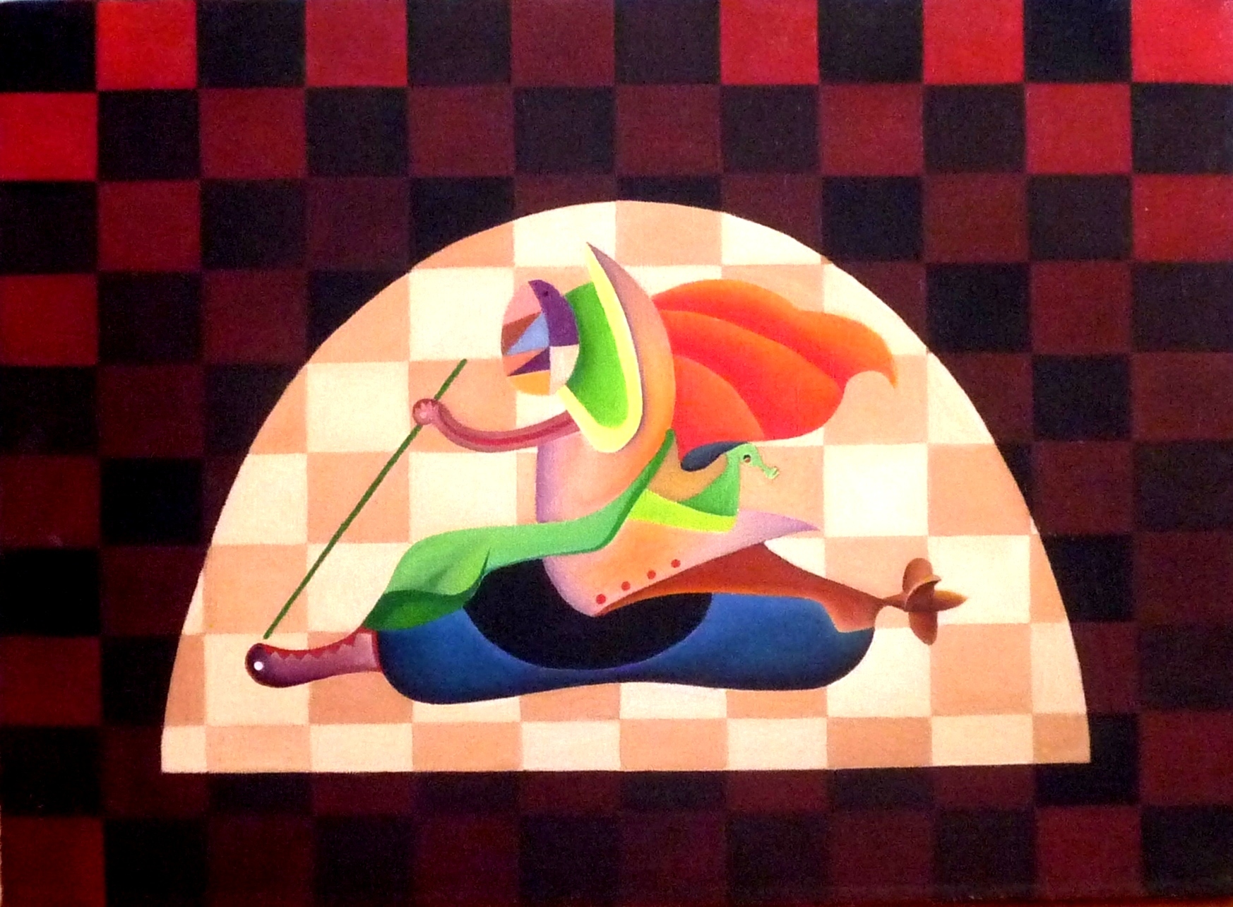 | Man könnte dieses Bild auch "Die Eile" nennen. Ein Wesen eilt oder fliegt mit wehendem roten Umhang, um vielleicht eine Botschaft zu übermitteln. Als Antrieb benutzt es nicht nur seine Beine sondern auch einen Propeller oder eine Schiffsschraube. Auf seiner Reise führt es einen grünen Hund mit sich. - Als Blickfang wurden für das Bild die kräftigen Farben Blau, Braun und Rot benutzt. |