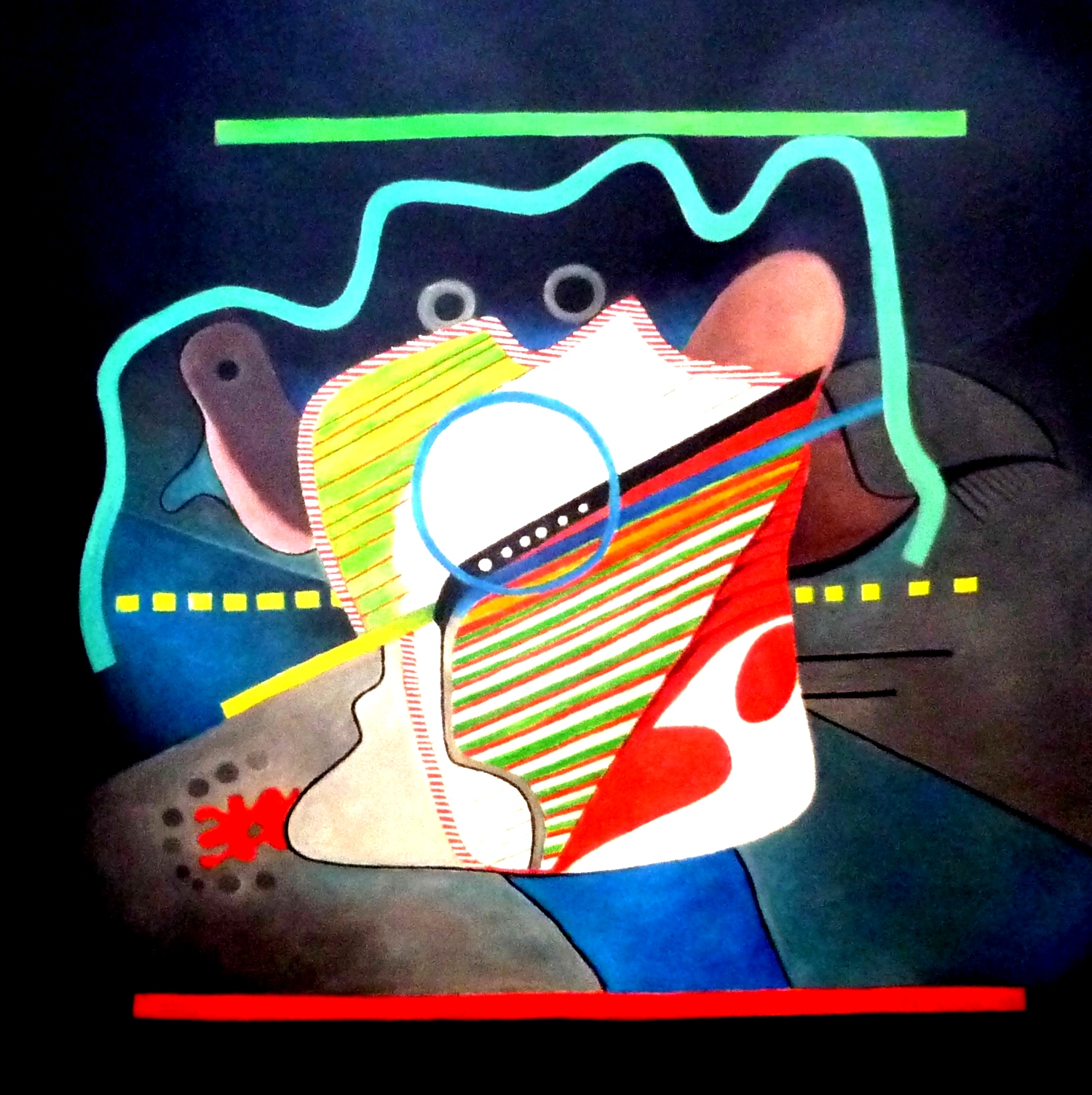 | Es ist schwierig, für dieses ziemlich abstrakte Bild einen passenden Namen zu finden, und der gewählte Titel ist eine Notlösung. Aber immerhin kann man ein Buch im Bilde finden, das zugleich einen wichtigen Anteil des Kopfes einnimmt, der auf dem blauen Hals sitzt. - Gespannt war ich, ob die Wirkung der beiden nur etwas verschiedenen Grüns im oberen Teil des Bildes zu ertragen ist, aber ich finde, es geht. |