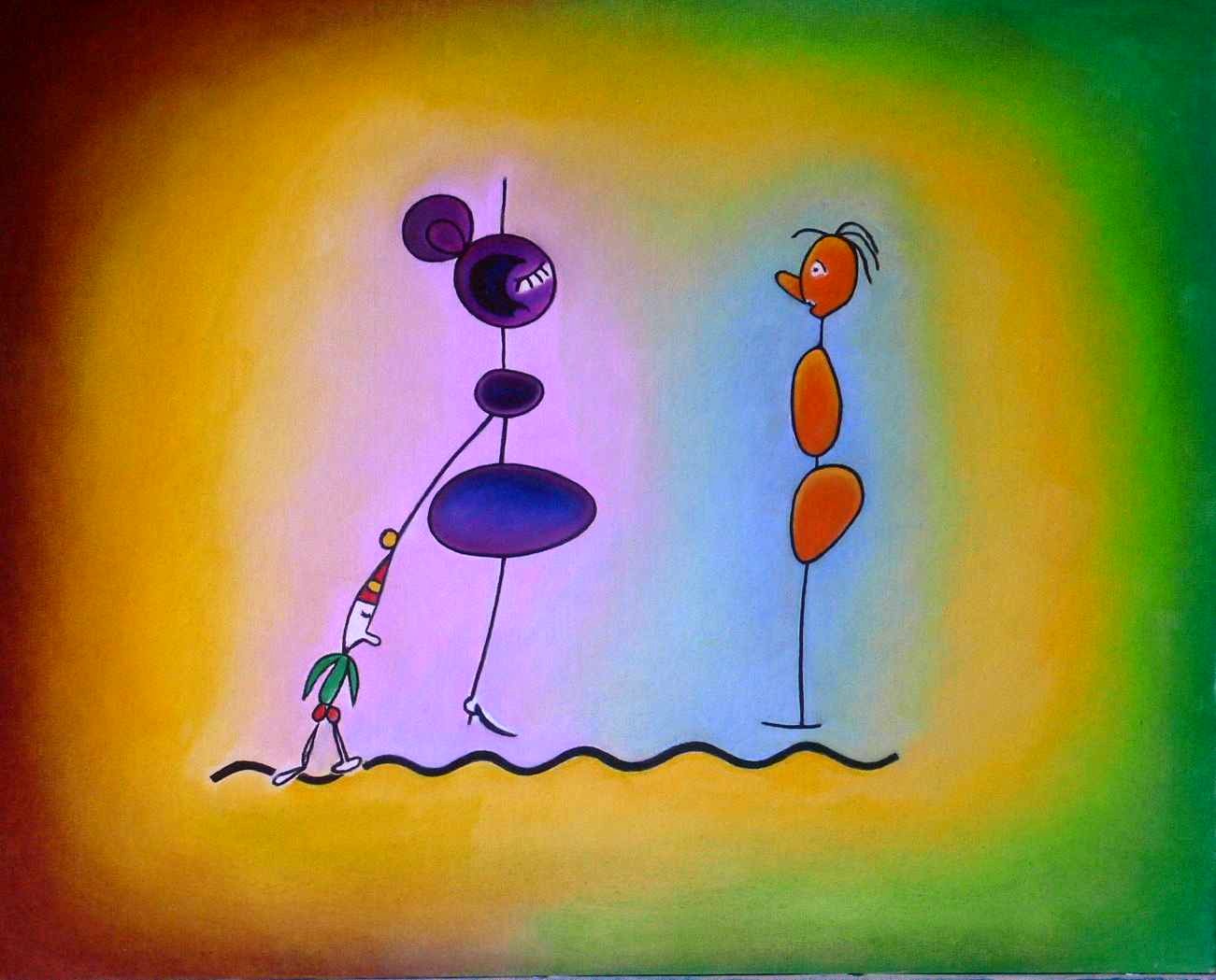 | Dieses Bild spricht für sich selbst. Typisch ist aber die offensichtliche mentale Überlegenheit der Frau, die mithilfe ihrer Puppe zeigt, wie man Männer zu behandeln hat. Der Mann hingegen schwankt zwischen Verlangen und Flucht. |