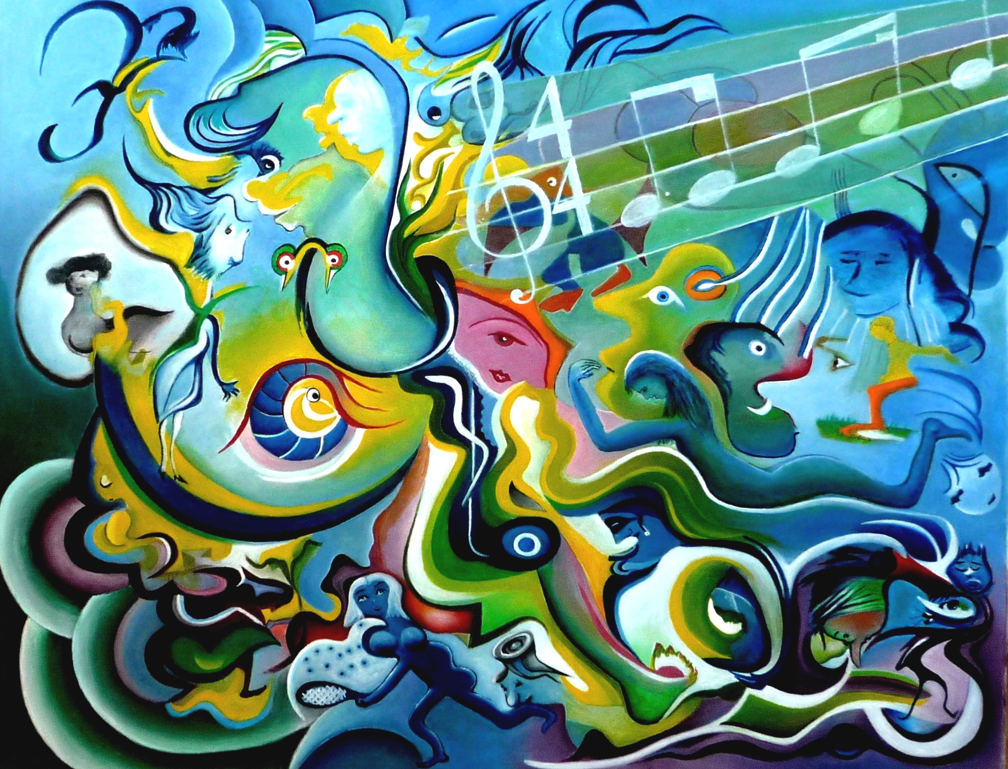 | Die Dame mit dem rosaroten Frauengesicht befindet sich inmitten von lauter Dingen und dargestellten Begriffen, von denen ich als Mann glaube, dass sie für Frauen wichtig sind - also Männer, andere Frauen, Sport (wie etwa Tennis, Motorradfahren oder Skifahren) und Musik. Kinder und Küche sind zufällig hier zu kurz gekommen.. |