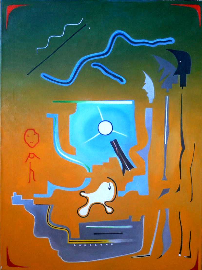 | Das Geheimnis liegt in der Deutung dieses Bildes. Diese gelingt ebenso wenig mir, noch den drei langen, dünnen Gestalten rechts im Bilde, noch dem weißen hundeähnlichen Tier, das eine Träne vergießt. Da ist man schon froh, wenigstens in dem roten Strichmännchen etwas wohltuend Vertrautes in diesem Bilde entdecken zu können. |