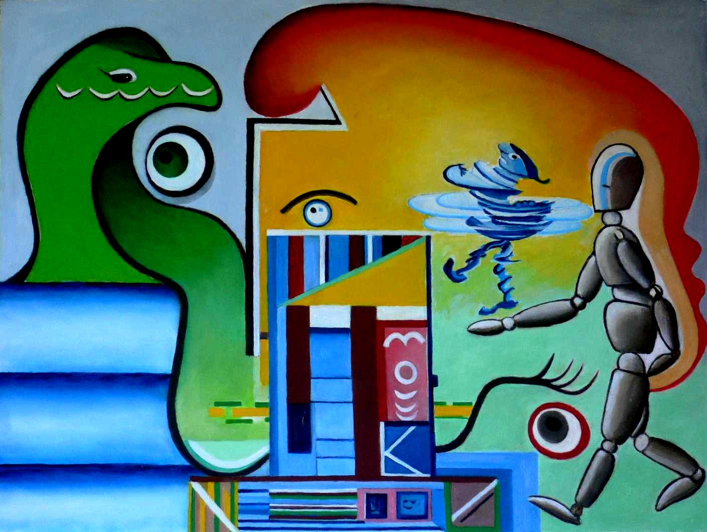| Das Bild zeigt, wie gerade eine Gliederpuppe einem großen Raubvogel eine Tanzpuppe anbietet, die nach den Klängen des Radios (unten im Bilde) tanzt. Ich gebe ja zu, dass es sich hier um ein recht merkwürdiges und seltenes Motiv handelt. |