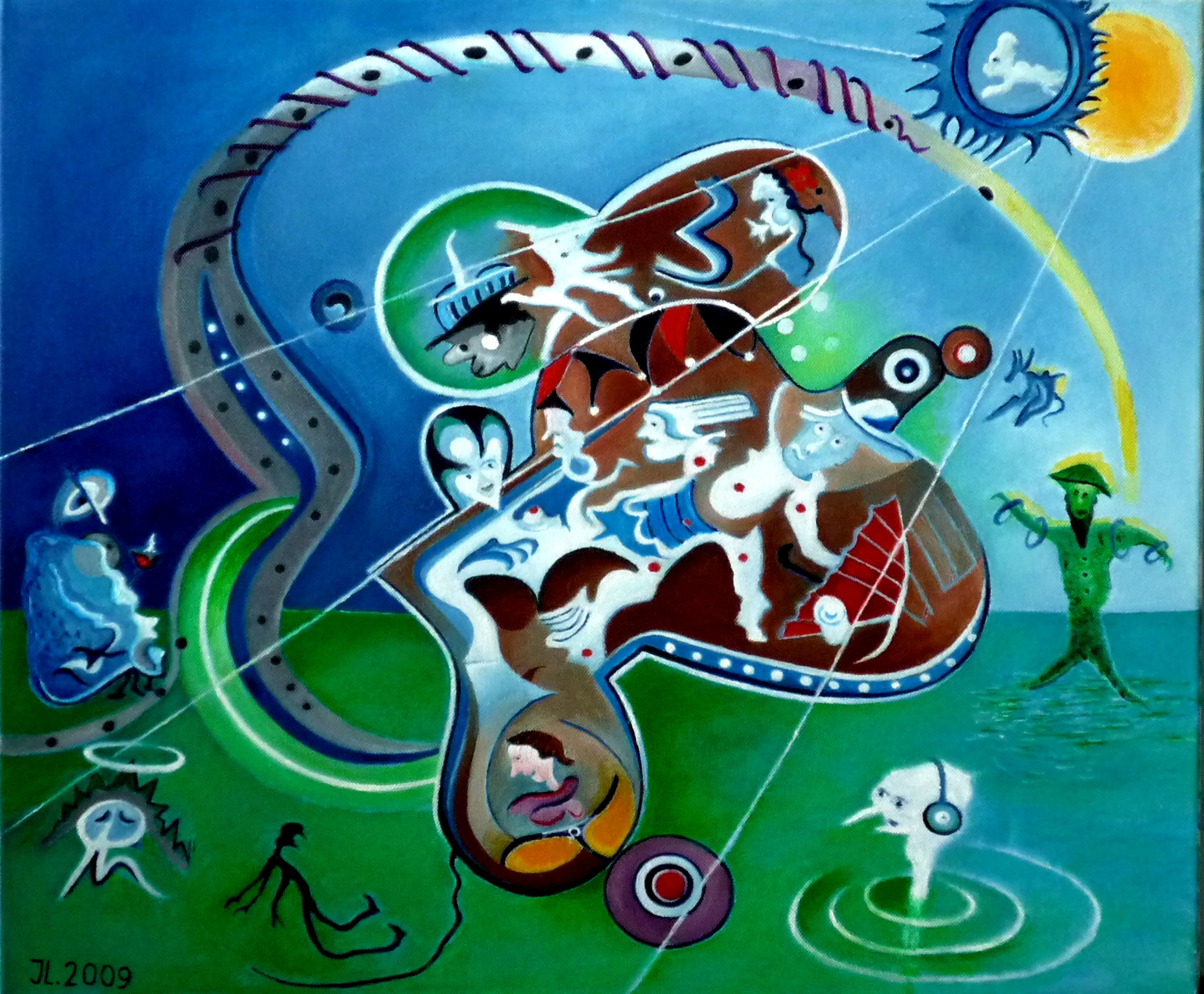 | Ursprung zu diesem Bild war ein Kaffeefleck, der durch ein Missgeschick auf der Tischdecke eines gepflegten Hotels entstanden war. Da mich seine Form interessierte, fotografierte ich ihn und malte zu Haus in ihm und um ihn herum lauter Unsinn. Es war eben ein Experiment. |