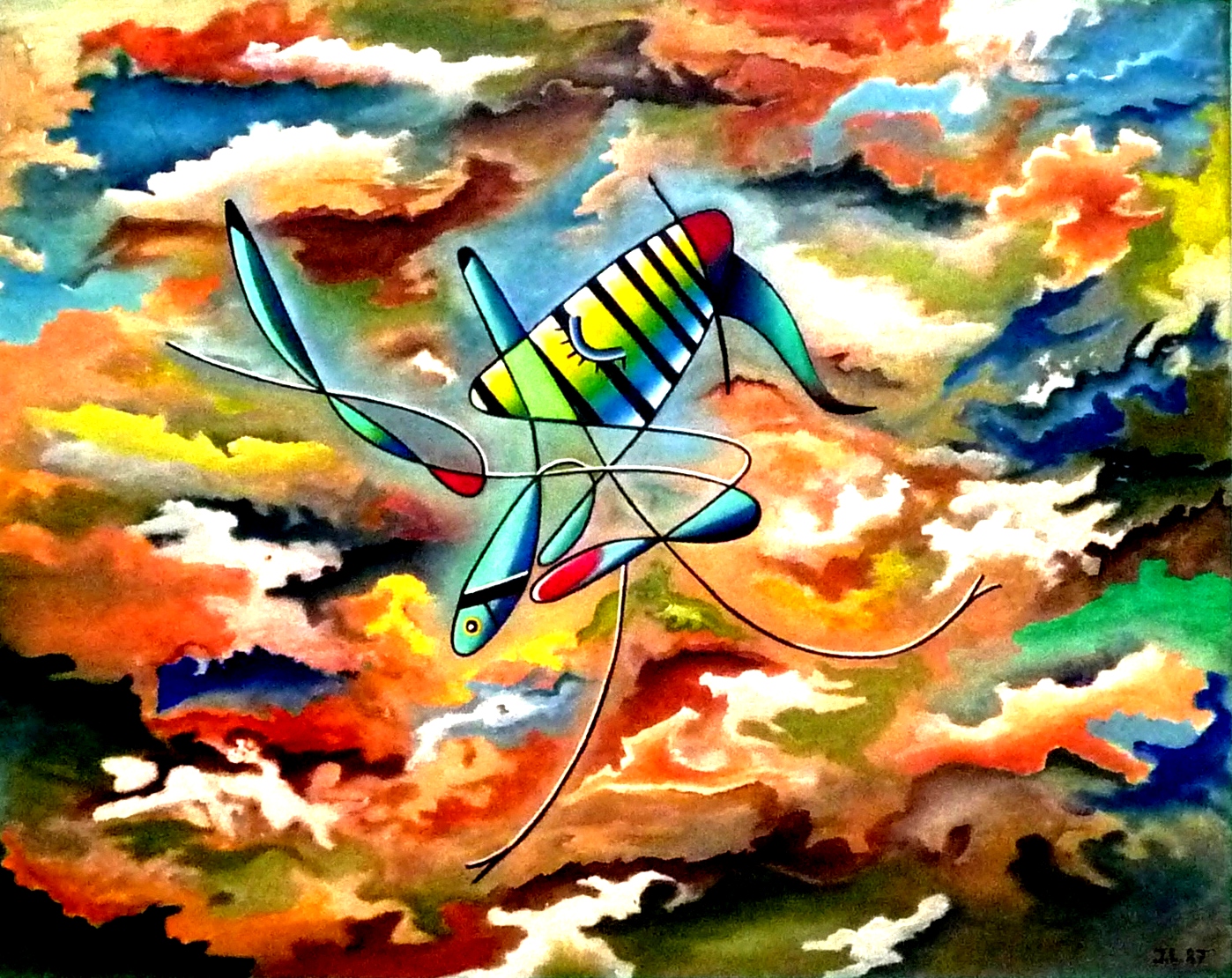 | Der "Luftikus" ist ein schönes Beispiel für lullische Malerei (Näheres zu "lullish" s. in Reiter: Biografie ). Die Vorgabe war ein ziemlich langer und komplizierter Strich, zu dem dann allerdings auch eine Menge anderer Zutaten - ganz zu schweigen vom Wolkenhintergrund - hinzugefügt wurde. |