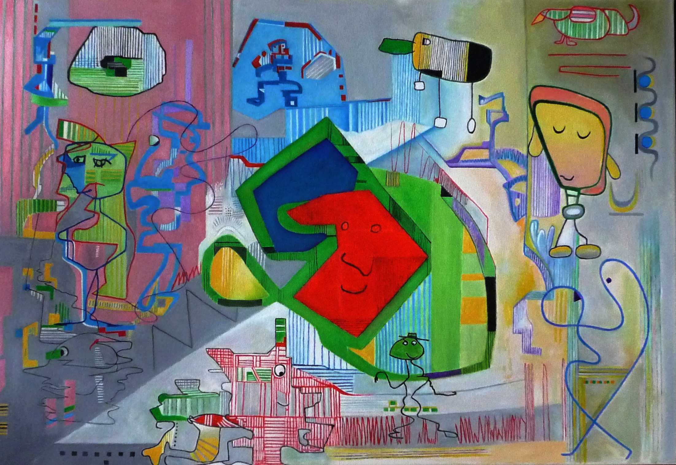 | Der Name "Nonixe" signalisiert ein skurriles, unkonventionelles Bild. Ursprünglich entstand es auf einem PC, gemalt mit dem Zeigefinger auf dem touchpad. Es berührt ein Sammelsurium von Themen als da sind kindliche Motive, ausgelassene Lebensfreude und Familiensymbolik bis hin zum Rotlichtmilieu. Das Zentrum des Bildes zeichnet sich durch besonders kräftige Farben aus. - Ich habe das Bild dann, so gut es ging, in dieses Ölbild übertragen. |