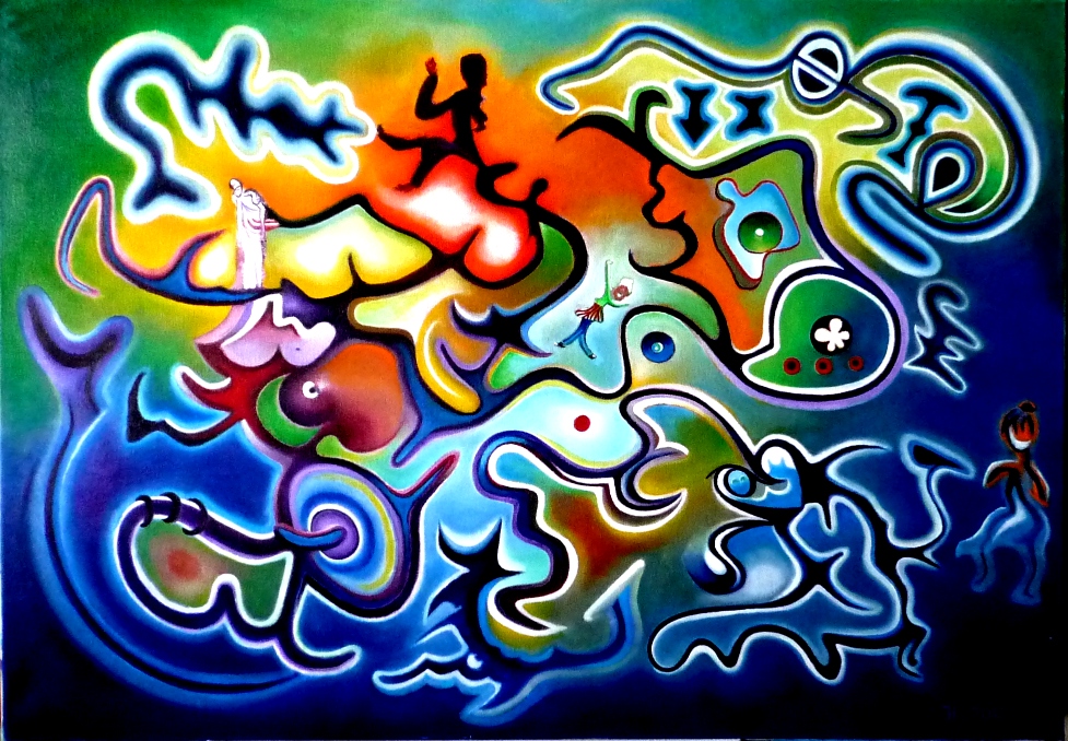 Eine Welt voller geheimnisumwitterter Figuren und Formen, und oben im Bild sitzt die Märchentante, die dazu vielleicht die passenden Märchen erzählt.