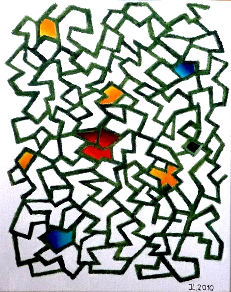 | Dieses Bild beschäftigt sich mit dem Zusammenspiel einer monotonen Struktur und sparsam eingefügten bunten Feldern. Es sind so wenige, dass sie dem Betrachter gerade noch als Einzelindividuen ins Auge fallen. Sie geben mit ihren kräftigen Farben dem Bild einen besonderen Reiz. |