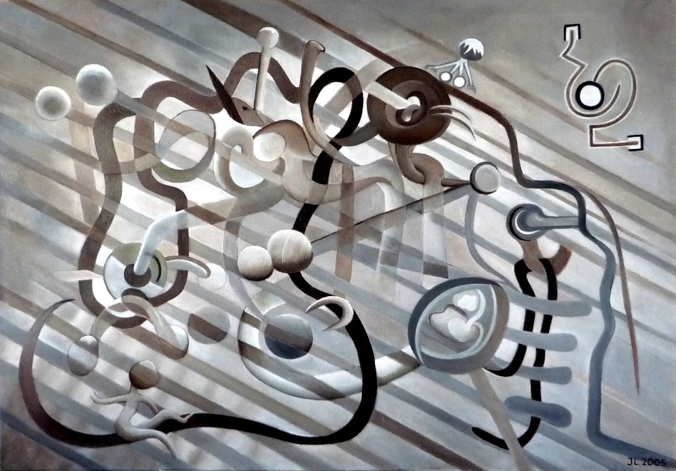 | An einem schönen Sonnentag hatten mich die Schattenstreifen der Fensterjalousie an der Zimmerwand inspiriert. Sie bildeten den Grundstock zu diesem Bild. Zu den Streifen brauchte ich dann nur noch einige weitere helle und dunkle Bänder, Kugeln und zwei Puppenbilder hinzu zu fügen, um ein Schattenspiel, wie dieses, zu erzielen. |