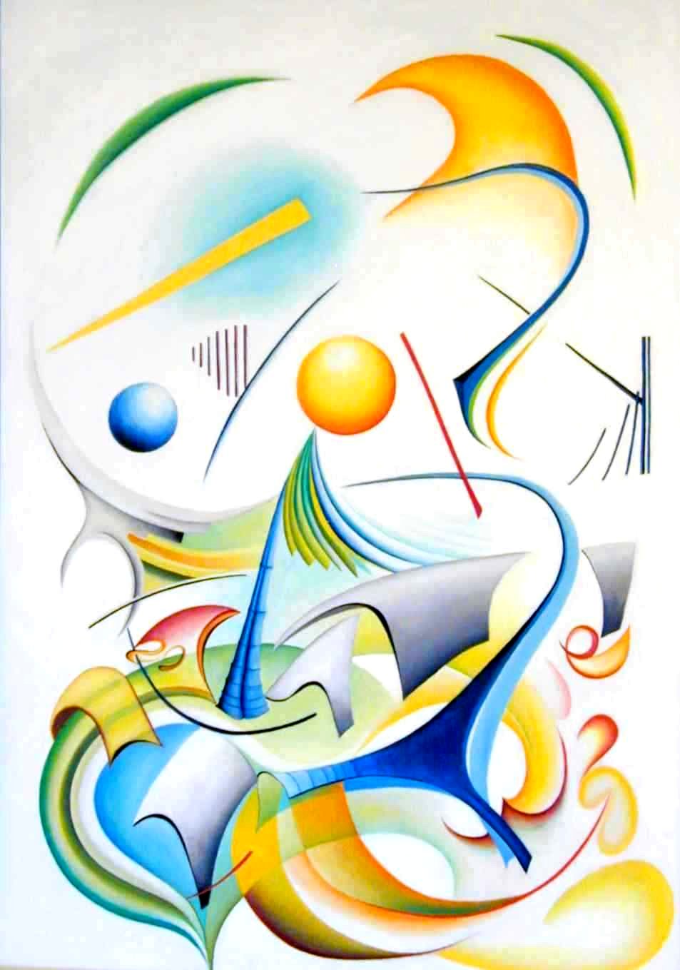| Eigentlich sollte ich dies Bild "ohne Titel" nennen, aber wenn überhaupt, dann ist "schwungvoll" schon am ehesten zutreffend. Beim Malen fühlte ich mich wie ein Schlittschuhfahrer, der mit schönen Schwüngen über die Eisbahn schwebt. Wer will, kann in der orangenen Kugel über der Bildmitte den Kopf eines Bauern sehen, der mit der Aussaat beschäftigt ist. |