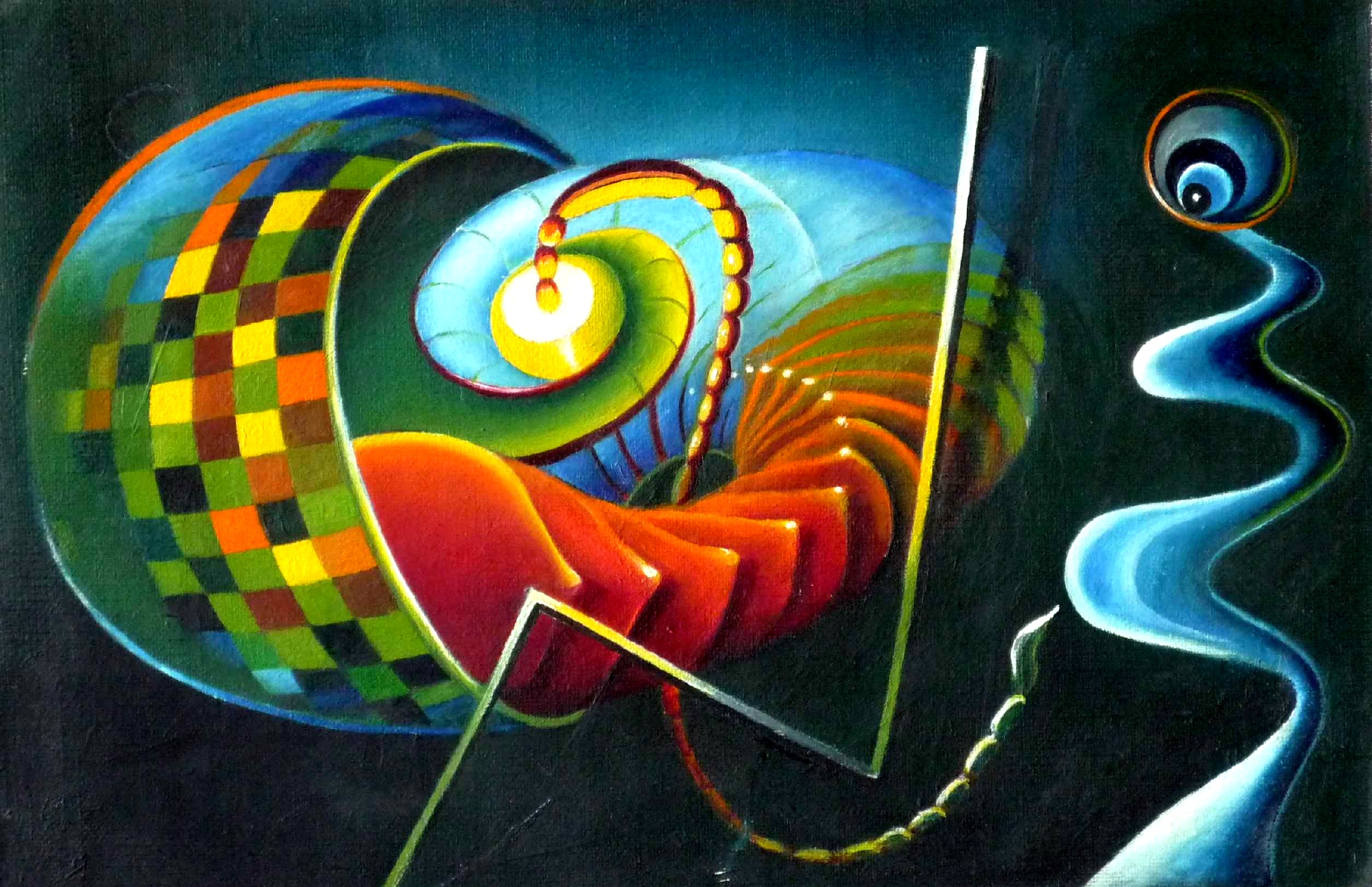 | In diesem Bilde reizte mich das Nebeneinander verschiedener Formengruppen. Im vorliegenden Falle waren es die bunten Kästchen des Korbes links, der Fächer aus roten Blättern mit gelben Spitzen und die Unterteilung des Stachels in kleine Abschnitte. Im Vordergrund steht jedoch die erotische, neckende Spielerei des Stachels mit der Frau, die besorgt und zugleich belustigt dem Treiben zusieht. |