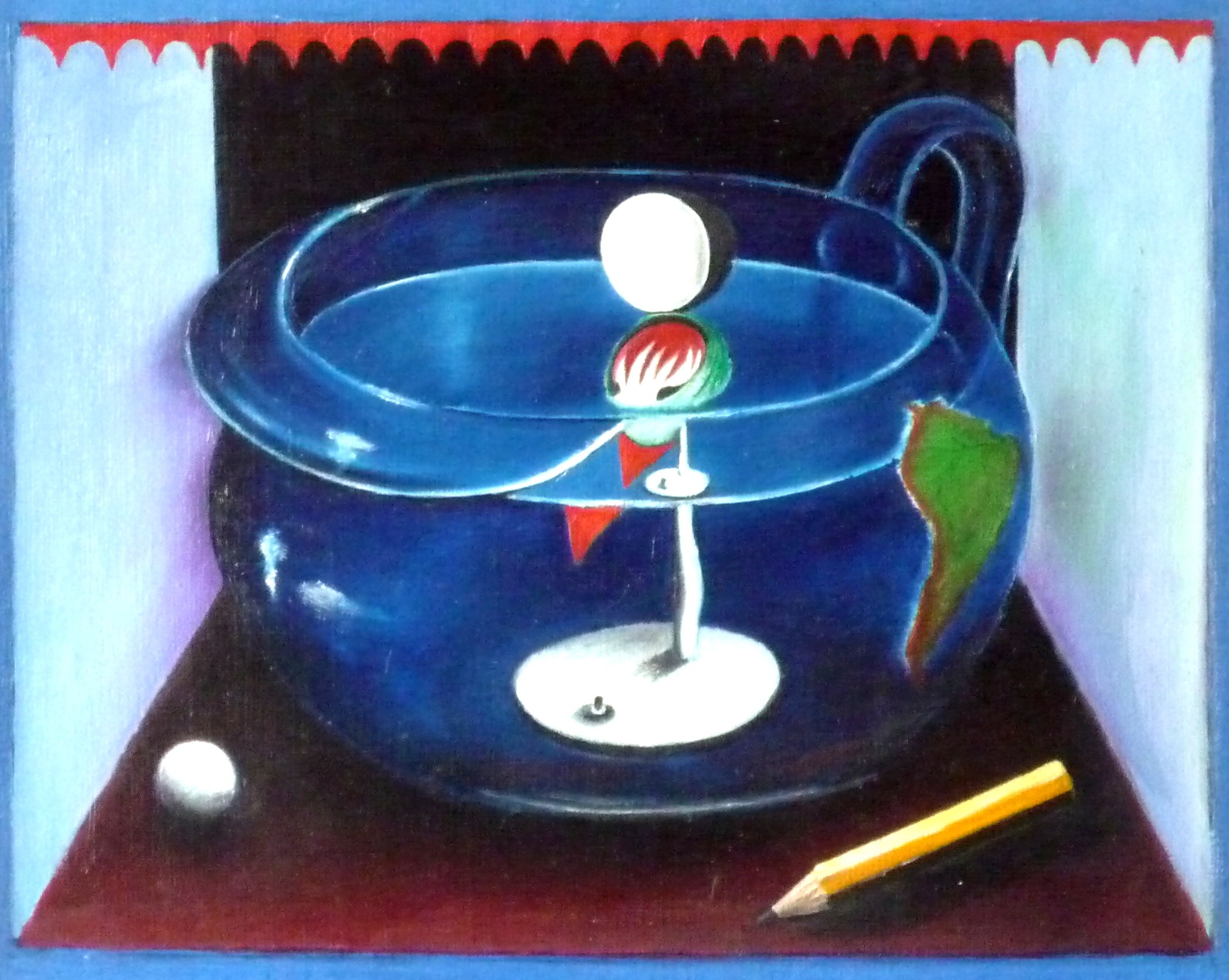 | Eine Schreibtischlampe, die nach oben hin zunächst in ein Schnabeltier mutiert, um dann noch weiter oben als U-Boot-Periskop zu enden, ist in einem gläsernem Nachttopf auf Tauchstation gegangen. Um klar zu machen, dass es sich bei dem Gewässer im Nachttopf immerhin um ein Weltmeer handelt, habe ich den afrikanischen Kontinent auf die Wandung des Glasgefäßes gemalt. Bleistift und weiße kleine Kugel rücken die wissenschaftlich Bedeutung des hier Gezeigten ins rechte Licht. |