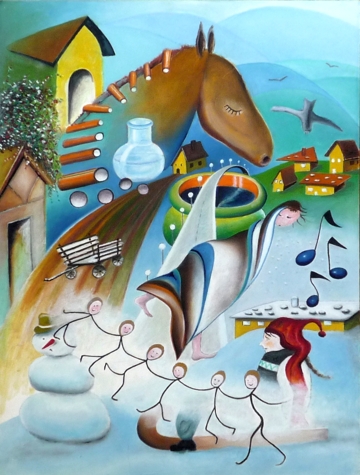 | Thema: Der Winter weicht dem Frühling. Jetzt gerade noch: Schneemann, Kinderreigen, Schlittenfahren. Aber schon entschwebt der Winter (hier als Frau dargestellt). Braune Äcker, eisfreie Brunnen, grüne Wiesen und schneefreie Dächer tauchen in der Ferne auf. Und auf die Pferde wartet harte Arbeit. |